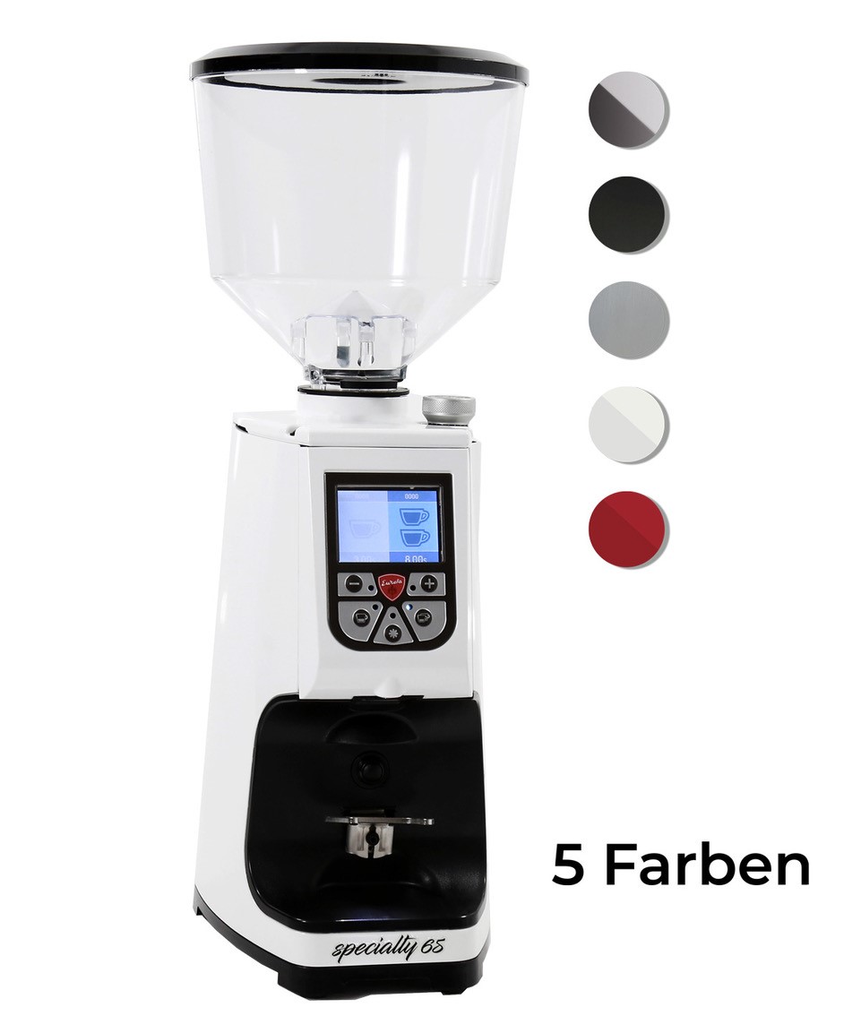 Die Eureka Atom Specialty 65 verfügt zudem über ein farbiges digitales Display. Damit lässt sich die genaue Mahlzeit für 1 oder 2 Portionen für den Siebträger einstellen oder per Start/Stopp-Modus mahlen. Die Einstellungen lassen sich speichern, so kannst du das perfekte Mahlergebnis wiederholen. Durch den patentierten Feineinstellungsmechanismis kann der Mahlgrad stufenlos eingestellt werden. Damit erzielst du das perfektes Mahlergebnis. Besonders hilfreich ist dabei auch das Anti-Elektrostatik-System der Kaffeemühle Atom Specialty 65. Es sorgt dafür, dass das Mahlgut gleichmäßig aus der Mühle fällt und sich keine Klümpchen bilden, da es elektrostatische Aufladung verhindert.